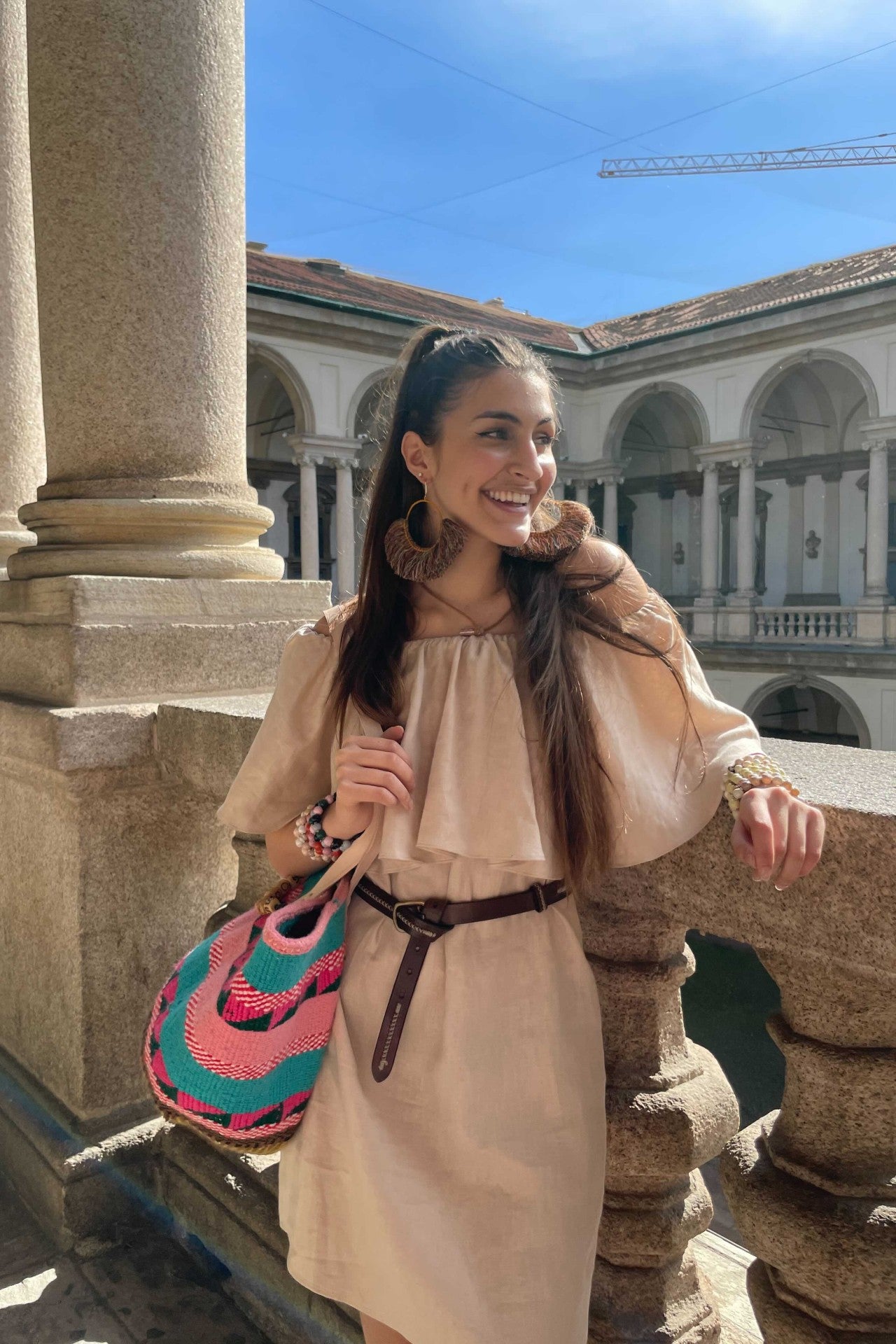 Don't be afraid to throw it in your bags because this amazing natural linen is even more beautiful when it's a bit crumpled! This dress is such a versatile piece for vacations, you can wear it at the beach, for lunch in town or for relaxing in the evening. Made from lightweight linen, it has an elasticized off-the-shoulder neckline and is trimmed with pretty ruffles. Tie the attached belt to your hair or the handles of a basket bag.